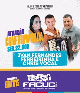 Prepare-se para uma noite de muita música e animação na Feira de Arte e Cultura de Córrego (FACUC) 2024! No dia 22 de novembro, sexta-feira, teremos apresentações de peso com Ivan Fernandes, Ferreirinha e Chris Vocal trazendo o melhor do forrozinho para para agitar a galera, ouvir, dançar e se apaixonar.